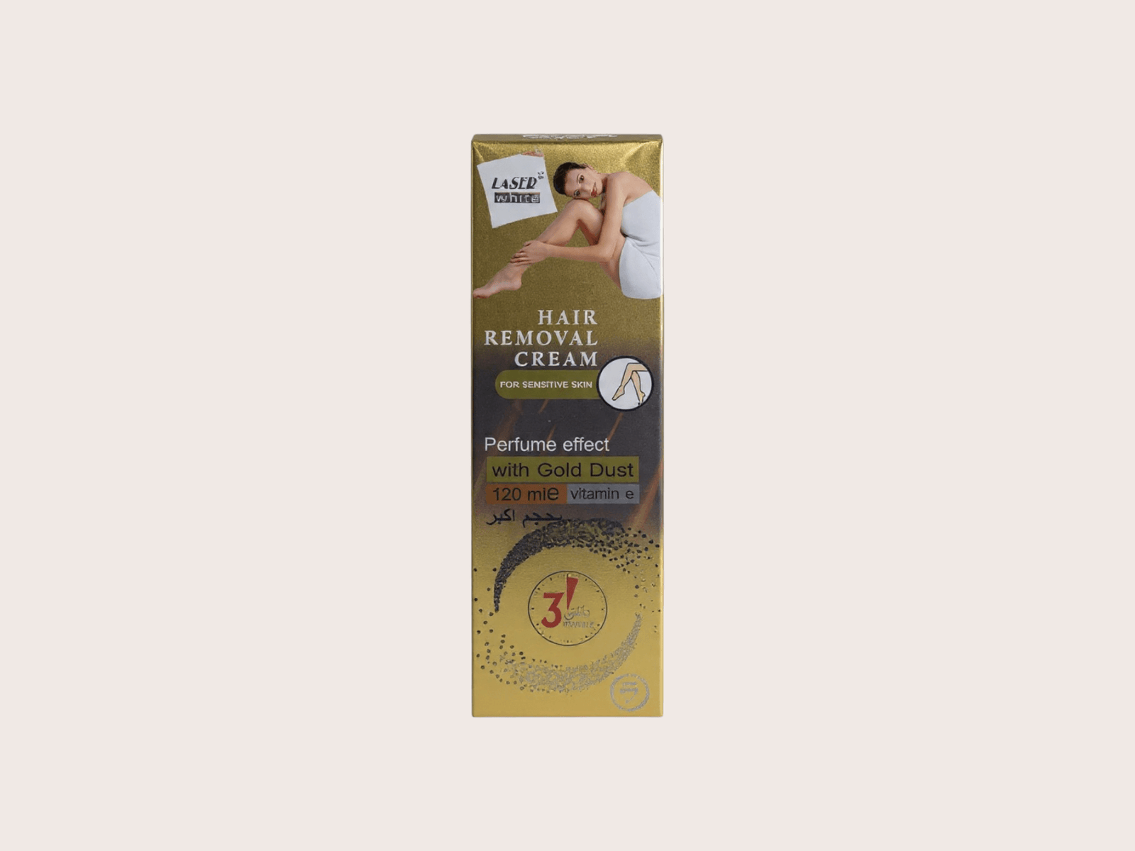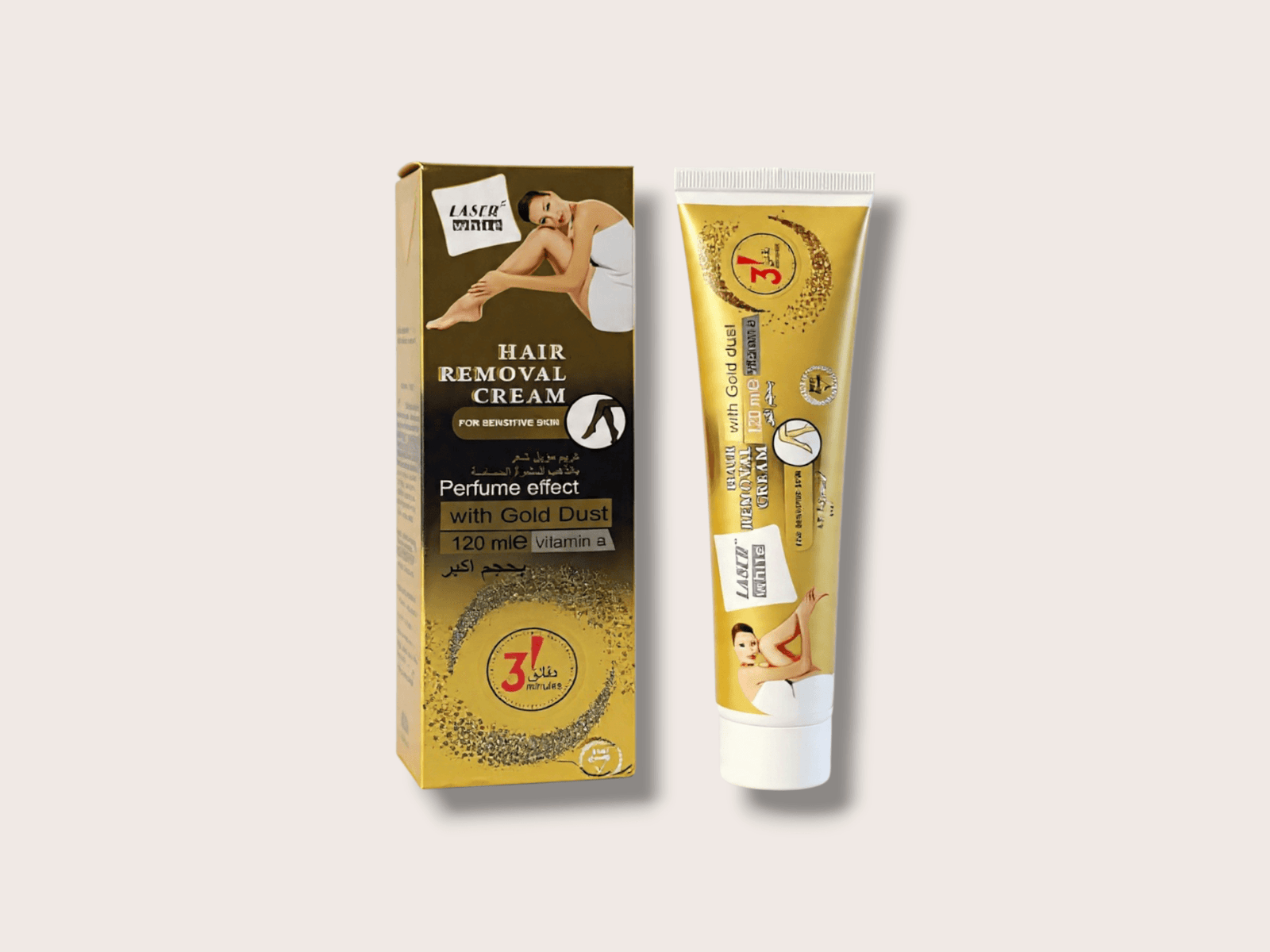 احصلي على بشرة ناعمة كالحرير في 3 دقائق فقط مع كريم إزالة الشعر من ليزر وايت، التركيبة المثالية للبشرة الحساسة والمعززة بغبار الذهب لترطيب فائق.